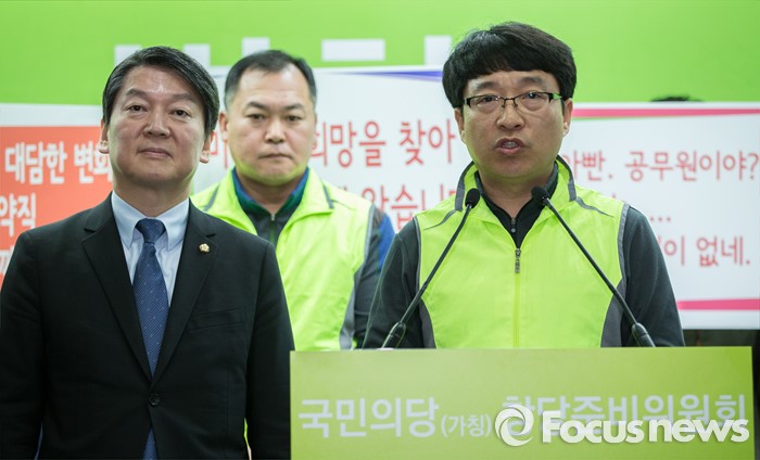 (서울=포커스뉴스) 시설관리원 배성춘씨가 29일 오후 서울 마포구 국민의당 당사에서 입당 기자회견을 하고 있다.