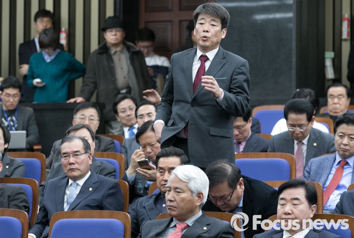 (서울=포커스뉴스) 신계륜 더불어민주당 의원이 29일 오후 서울 여의도 국회에서 열린 의원총회에 참석해 이종걸 원내대표에게 사회적경제 기본법 협상과 관련 질의하고 있다.