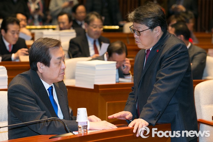 (서울=포커스뉴스) 김무성(왼쪽) 새누리당 대표와 조원진 원내수석부대표가 29일 오후 서울 여의도 국회에서 열린 의원총회에 참석해 논의하고 있다.