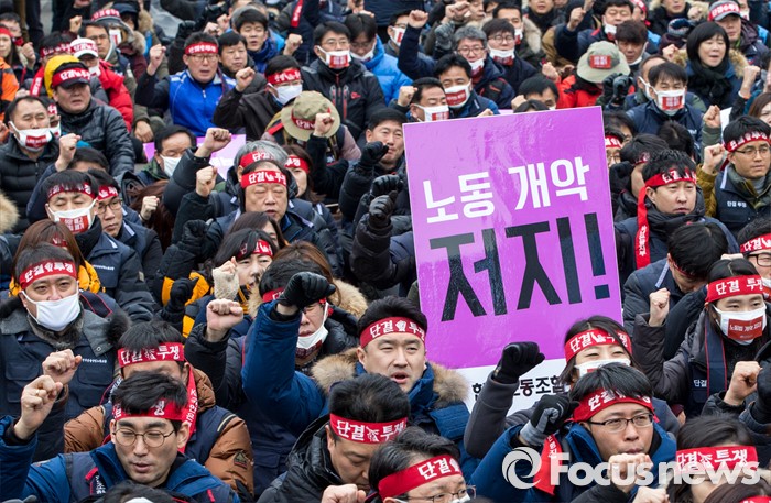 (서울=포커스뉴스) 29일 오후 서울역 광장에서 열린 '한국노총 전국 단위노조 대표자 총력투쟁 결의대회'에 참석한 조합원들이 정부가 발표한 양대 행정지침 폐기를 촉구하는 구호를 외치고 있다.
