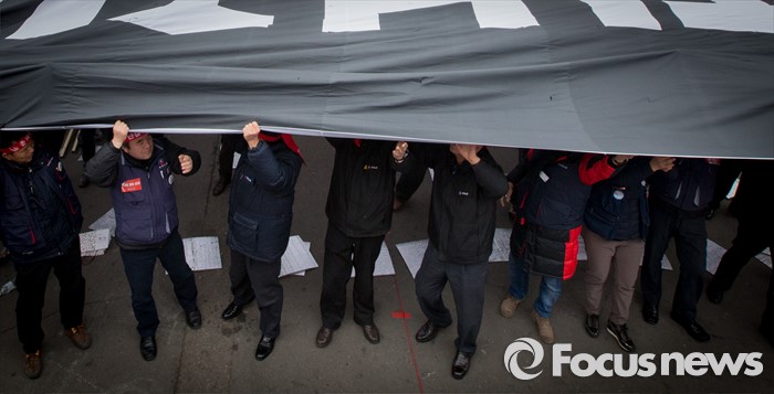 (서울=포커스뉴스) 29일 오후 서울역 광장에서 열린 '한국노총 전국 단위노조 대표자 총력투쟁 결의대회'에 참석한 조합원들이 정부가 발표한 양대 행정지침 폐기를 촉구하는 대형 현수막을 펼치고 있다.