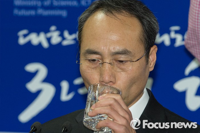 (과천=포커스뉴스) 29일 오후 경기 정부과천청사 미래창조과학부에서 조규조 통신정책국 국장이 제4이동통신 심사 결과 발표를 마치고 취재진의 질문에 답변하던 중 물을 마시고 있다.
