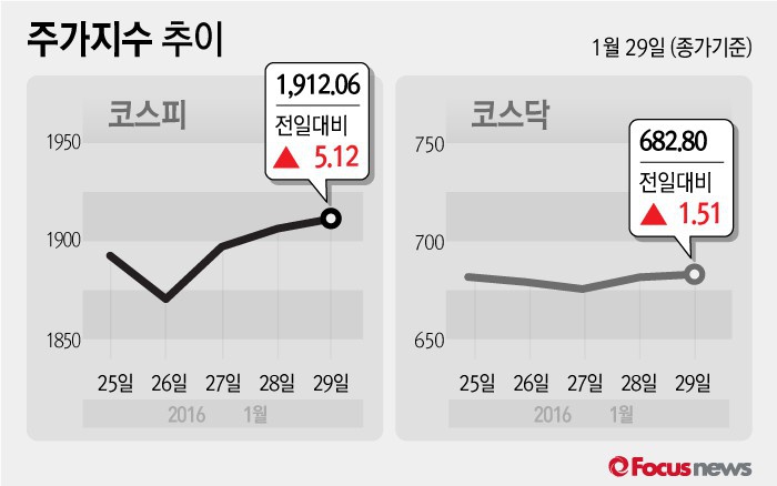 (서울=포커스뉴스) 29일 코스피지수는 전날 보다 0.27%(5.12포인트) 오른 1912.06에 장을 마쳤다. 코스닥지수는 전일 대비 0.22%(1.51포인트) 오른 682.80에 마감했다.