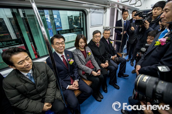 (수원=포커스뉴스) 강호인(왼쪽 두 번째) 국토교통부 장관과 남경필(왼쪽) 경기도지사를 비롯한 주요내빈들이 29일 오후 경기도 수원시 영통구 신분당선 광교중앙역에서 열린 '정자-광교 복선전철 개통행사'를 마친 뒤 시승하고 있다.