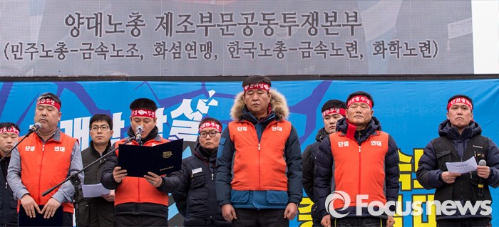 (서울=포커스뉴스) 29일 오후 서울 종로구 정부서울청사 앞에서 열린 '2대지침 폐기, 양대노총 공동투쟁 및 불복종 투쟁 선포식'에 참석한 양대노조 제조공투본 위원장들이 투쟁선언문을 낭독하고 있다. 앞줄 왼쪽부터 김동명 한국노총 화학노련 위원장, 김상구 민주노총 금속노조 위원장, 김만재 한국노총 금속노련 위원장, 신환섭 민주노총 화섬연맹 위원장.