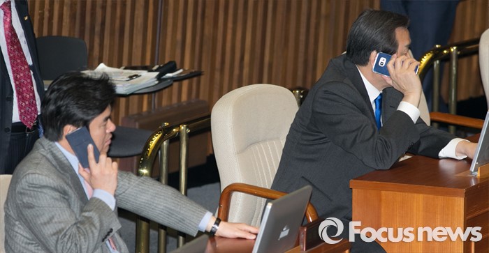 (서울=포커스뉴스) 29일 오후 서울 여의도 국회에서 예정된 338회 국회(임시회) 4차 본회의에 참석한 김무성(오른쪽) 새누리당 대표와 원유철 원내대표가 누군가와 통화하고 있다.