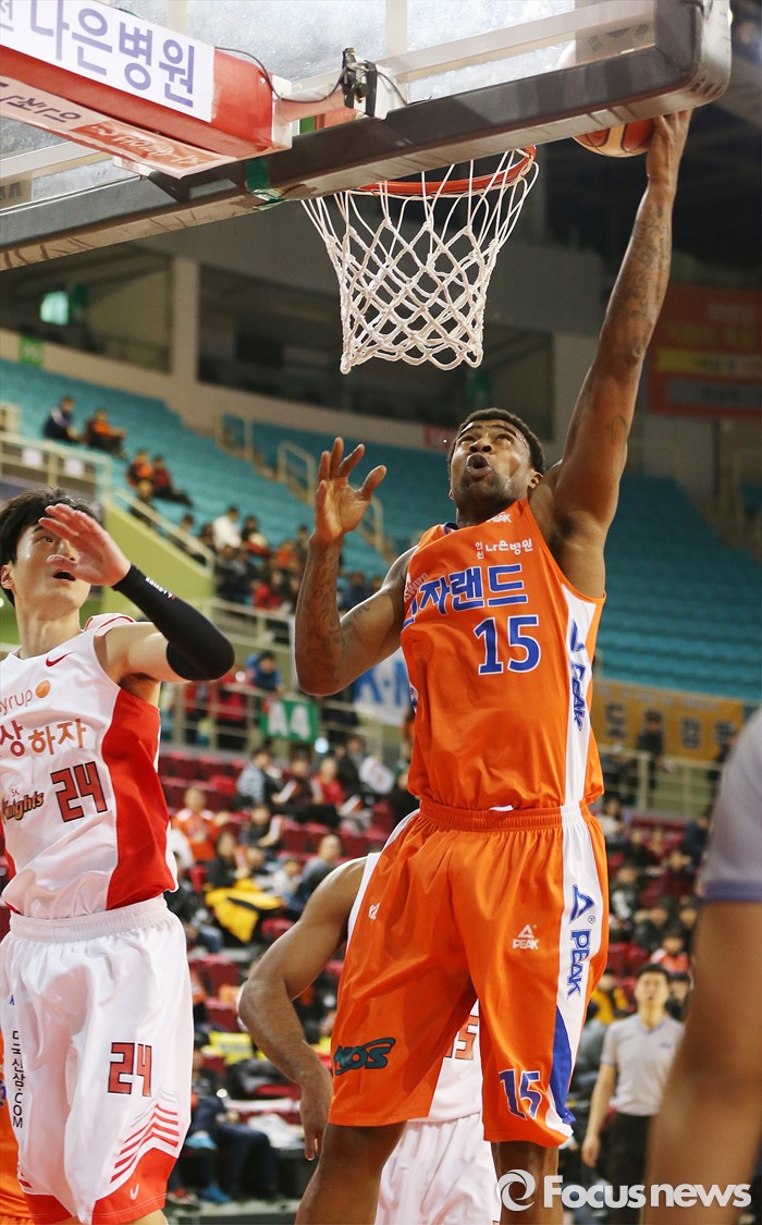 (인천=포커스뉴스) 29일 인천 삼산체육관에서 열린 2015-2016 프로농구 전자랜드-SK 경기에서 전자랜드 포웰이 SK 오용준의 수비를 제치며 골밑슛을 시도하고 있다.