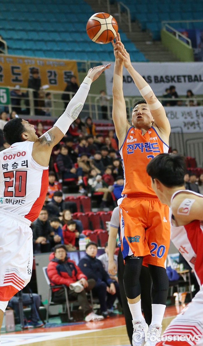 (인천=포커스뉴스) 29일 인천 삼산체육관에서 열린 2015-2016 프로농구 전자랜드-SK 경기에서 전자랜드 정영삼이 SK 박승리의 마크 위로 점프슛을 쏘고 있다.