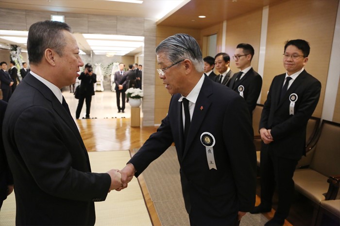 (서울=포커스뉴스) 29일 서울 강남구 삼성서울병원 장례식장에 마련된 故 최종건 SK그룹 창업주 부인 노순애 여사의 빈소에서 최신원(왼쪽에서 두번째) SKC 회장이 박용만 대한상의 회장과 인사를 나누고 있다. <사진제공=SK케미칼>
