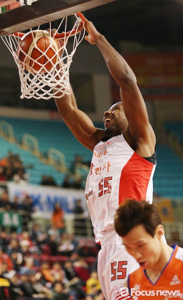(인천=포커스뉴스) 29일 인천 삼산체육관에서 열린 2015-2016 프로농구 전자랜드-SK 경기에서 SK 사이먼이 투핸드 덩크를 성공시키고 있다.
