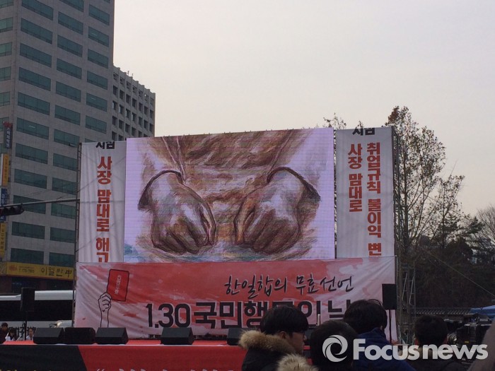 이날 집회에 참석한 구로고등학교 2학년 이찬진 학생은 집회를 위해 마련된 무대에 올라 “한‧일 협상이 타결된지 한달쯤이 지났다”며 “왜 우리 정부가 많은 국민이 잘못됐다고 하는 협상결과를 밀어붙이는지 모르겠다”고 비판했다.