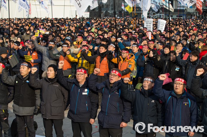 (서울=포커스뉴스) '민주노총 전국노동자대회'가 열린 30일 오후 서울광장에서 민주노총 조합원들이 정부의 '일반 해고'와 '취업규칙 변경' 양대 지침 철회와 노동개악 중단을 촉구하고 있다.