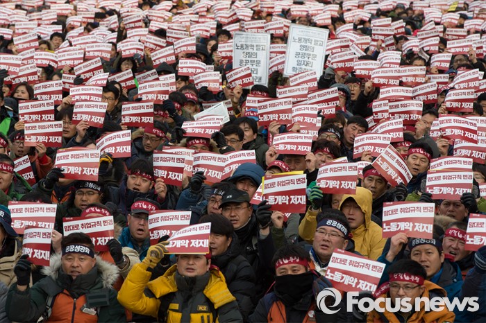 (서울=포커스뉴스) '민주노총 전국노동자대회'가 열린 30일 오후 서울광장에서 민주노총 조합원들이 정부의 '일반 해고'와 '취업규칙 변경' 양대 지침 철회와 노동개악 중단을 촉구하고 있다.