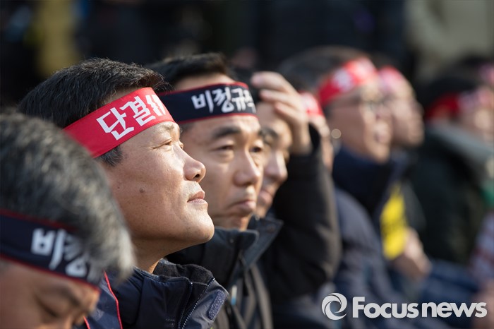 (서울=포커스뉴스) '민주노총 전국노동자대회'가 열린 30일 오후 서울광장에서 민주노총 조합원들이 정부의 '일반 해고'와 '취업규칙 변경' 양대 지침 철회와 노동개악 중단을 촉구하고 있다.