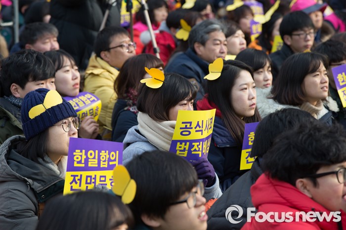 (서울=포커스뉴스) 한일 일본군 위안부 합의 무효와 정의로운 해결을 위한 전국행동 회원들이 30일 오후 서울광장에서 열린 '한일합의 무효선언 전국행동의 날' 행사에서 피켓을 들고 있다.