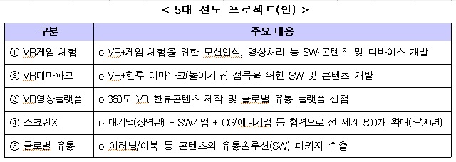 VR게임·체험 분야는 우리나라의 게임 개발 경험과 기술력을 토대로 신시장을 선점하는 것을 목표로 한다. VR테마파크는 K-POP, 캐릭터 등과 같은 한류콘텐츠에 VR기술을 접목해 전 세계 테마파크 시장에 동반진출할 계획이다. VR영상플랫폼은 방송, 공연, 평창 올림픽 등을 360도 VR영상 촬영해 한류 콘텐츠를 유통할 수 있는 플랫폼을 선점할 방침이다.