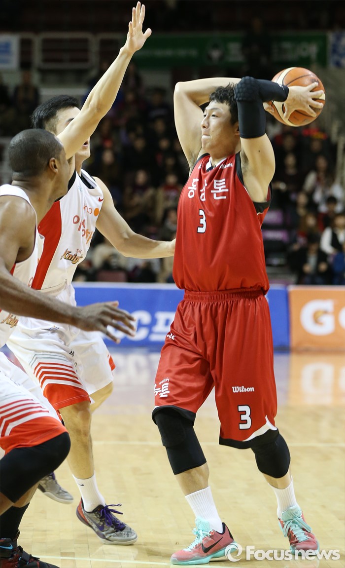 (안양=포커스뉴스) 31일 안양실내체육관에서 열린 2015-2016 프로농구 KGC-SK 경기에서 KGC 이정현이 SK 변기훈, 사이먼의 마크를 받으며 패스할 곳을 찾고 있다.