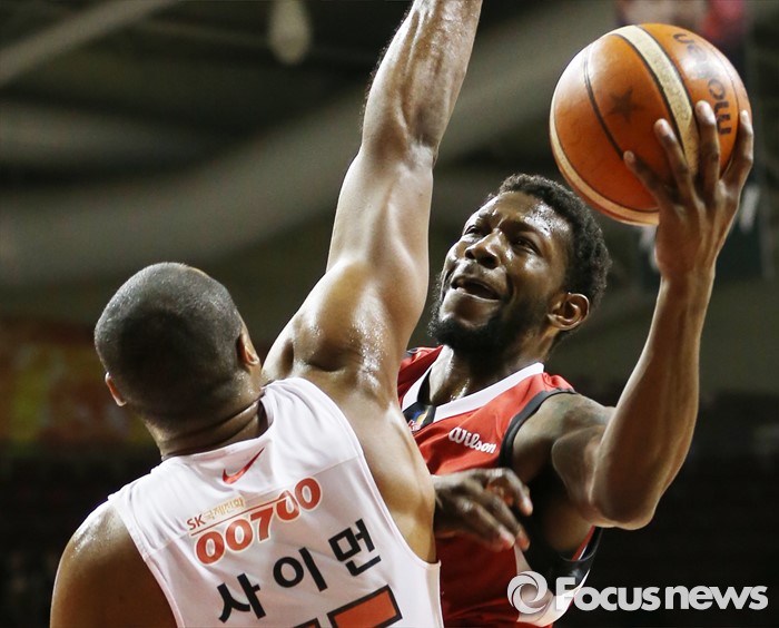 (안양=포커스뉴스) 31일 안양실내체육관에서 열린 2015-2016 프로농구 KGC-SK 경기에서 KGC 마리오 리틀이 SK 사이먼의 마크를 피하며 레이업슛을 시도하고 있다.