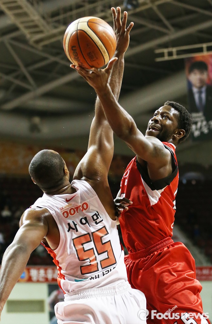 (안양=포커스뉴스) 31일 안양실내체육관에서 열린 2015-2016 프로농구 KGC-SK 경기에서 KGC 마리오 리틀이 SK 사이먼의 마크를 피하며 레이업슛을 시도하고 있다.