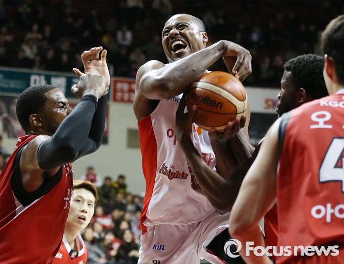 (안양=포커스뉴스) 31일 안양실내체육관에서 열린 2015-2016 프로농구 KGC-SK 경기에서 SK 사이먼이 KGC 수비 사이로 슈팅을 시도하다 마리오 리틀에게 파울을 당하고 있다.