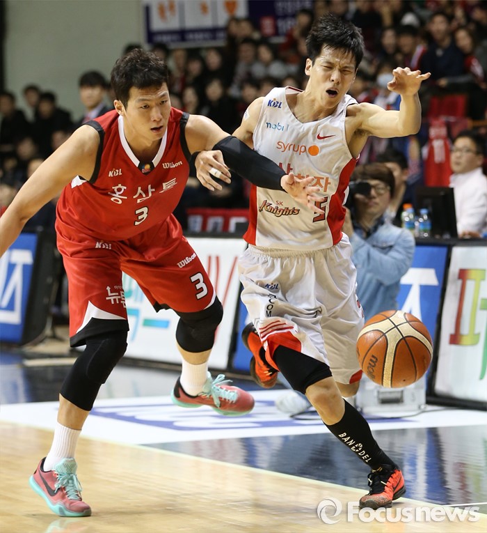 (안양=포커스뉴스) 31일 안양실내체육관에서 열린 2015-2016 프로농구 KGC-SK 경기에서 SK 김선형이 돌파를 시도하다 KGC 이정현에게 파울을 당하고 있다.