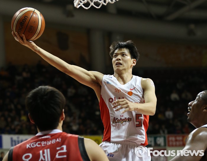 (안양=포커스뉴스) 31일 안양실내체육관에서 열린 2015-2016 프로농구 KGC-SK 경기에서 SK 김선형이 KGC 오세근을 앞에 두고 레이업슛을 시도하고 있다.