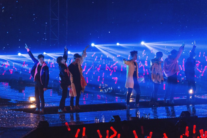 이어 각선미를 드러낸 원피스를 입고 홀로 등장한 김진환은 여자친구의 ‘오늘부터 우리는’에 맞춰 걸그룹 댄스를 선보여 웃음을 자아냈다. 뒤를 이어 여장을 한 멤버들이 단체로 무대에 올라 이엑스아이디의 ‘위아래’를 선보이자 객석에서는 비명에 가까운 환호가 터져 나왔다.