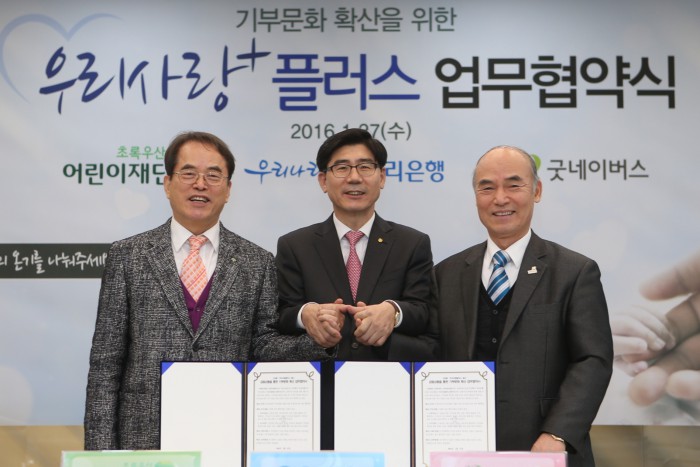 이 상품은 통장, 예·적금으로 구성돼 있고 적금의 경우 최고 연 3.65% 금리를 제공한다. 또 우리은행이 기부를 위해 제공하는 특별우대금리(최고 0.5%)를 초록우산 어린이재단 또는 굿네이버스의 사회공헌프로그램에 고객 명의로 기부할 수 있는 것이 특징이다.1월 27일 서울 중구 소공로 소재 우리은행 본점에서, 이광구 은행장(사진 가운데)이 사회복지법인 어린이재단 이제훈 회장(사진 왼쪽), 사단법인 굿네이버스 인터내셔날 이일하 회장과 함께 '기부문화 확산을 위한 업무협약'을 체결한 뒤 기념 촬영을 하고 있다. <사진제공=우리은행>