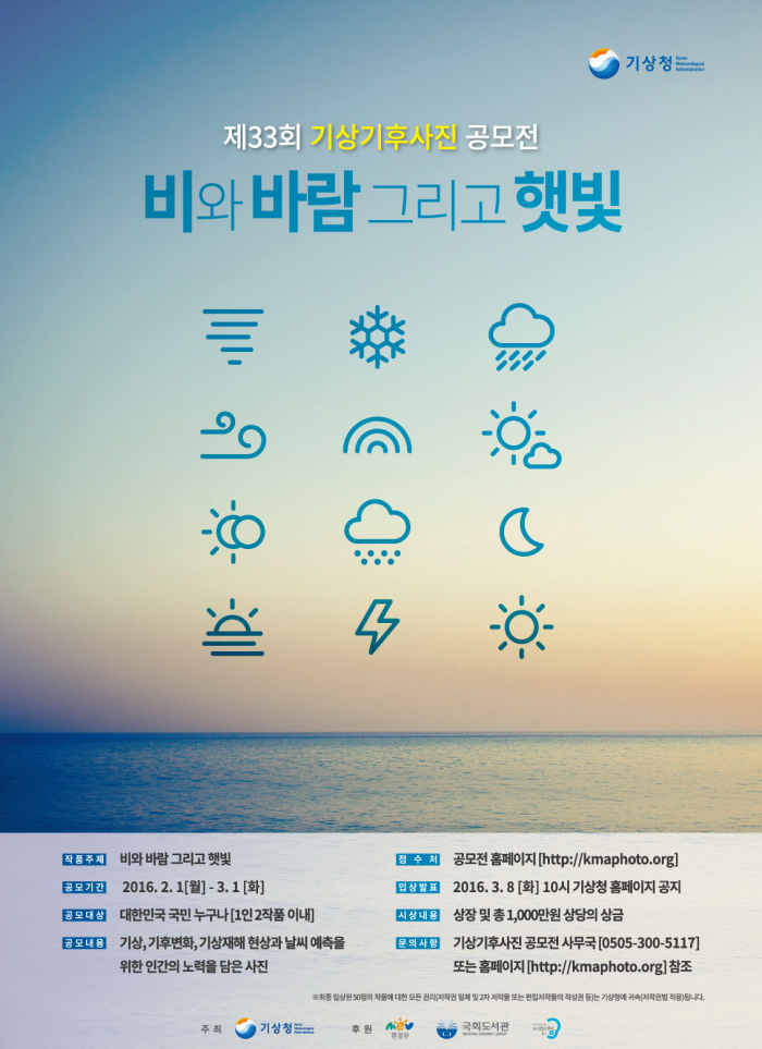 이번 공모전은 '비와 바람 그리고 햇빛'이라는 주제로 △기상 △기후변화 △기상재해 등을 담은 사진 작품을 공모전 홈페이지를 통해 2월1일부터 3월1일까지 한 달 동안 접수한다.