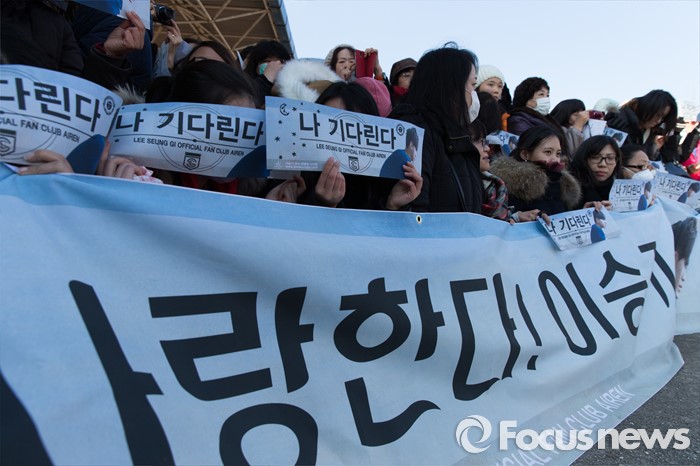 (논산=포커스뉴스) 1일 오후 충남 논산 육군훈련소 앞에서 가수 겸 배우 이승기의 팬들이 응원 문구가 적힌 현수막을 들고 입소를 기다리고 있다.