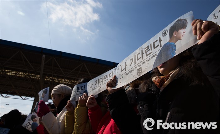 (논산=포커스뉴스) 1일 오후 충남 논산 육군훈련소 앞에서 가수 겸 배우 이승기의 팬들이 응원 문구가 적힌 현수막을 들고 입소를 기다리고 있다.