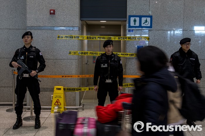 (인천공항=포커스뉴스) 인천국제공항에 폭발물 의심 물체와 함께 아랍어로 된 협박성 메모가 발견된 사건 수사가 진행되고 있는 1일 오후 폭발물 의심 물체가 발견된 인천공항 입국장 화장실에서 경찰병력이 경계 근무를 서고 있다.