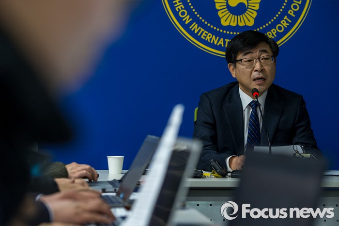 (인천공항=포커스뉴스) 인천국제공항에 폭발물 의심 물체와 함께 아랍어로 된 협박성 메모가 발견된 사건 수사가 진행되고 있는 1일 오후 인천공항경찰대에서 정성채 인천공항경찰대장이 사건 관련 브리핑을 하고 있다.