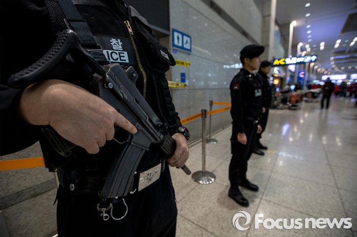 (인천공항=포커스뉴스) 인천국제공항에 폭발물 의심 물체와 함께 아랍어로 된 협박성 메모가 발견된 사건 수사가 진행되고 있는 1일 오후 폭발물 의심 물체가 발견된 인천공항 입국장 화장실에서 경찰병력이 경계 근무를 서고 있다.