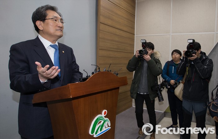 (청주=포커스뉴스) 노영민 더불어민주당 의원이 1일 오후 충북 청주 충북도청 기자실에서 4.13 총선 불출마 선언 기자회견을 하고 있다.