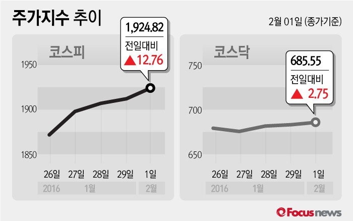 코스피는 1일 전 거래일보다 12.76포인트(0.67%) 상승한 1924.82에 거래를 마쳤다. 외국인은 1월 29일 1700억원 규모에 이어 이날 1852억원의 순매수로 지수를 끌어올렸다.