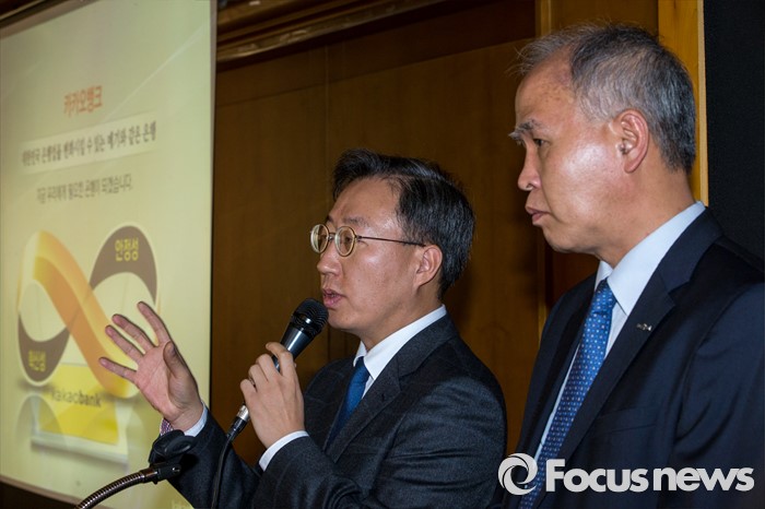 카카오뱅크는 지난해 11월 사업계획 설명회에서 폭넓은 활용이 가능한 포인트까지 제공하겠다는 방침을 전했다. 기존 카드사들로 흘러들어가는 수수료를 소비자와 가맹점에게 돌려준다는 내용으로 기존 카드업계의 지각변동을 예고하는 공격적 마케팅이라 평가할 수 있다.(서울=포커스뉴스) 인터넷전문은행 예비인가를 받은 한국카카오은행(카카오뱅크) 윤호영(왼쪽) 부사장과 이용우 한국투자금융지주 전무가 30일 오전 서울 중구 은행연합회에서 세부사업 계획 발표를 하고 있다. 2015.11.30 강진형 기자
