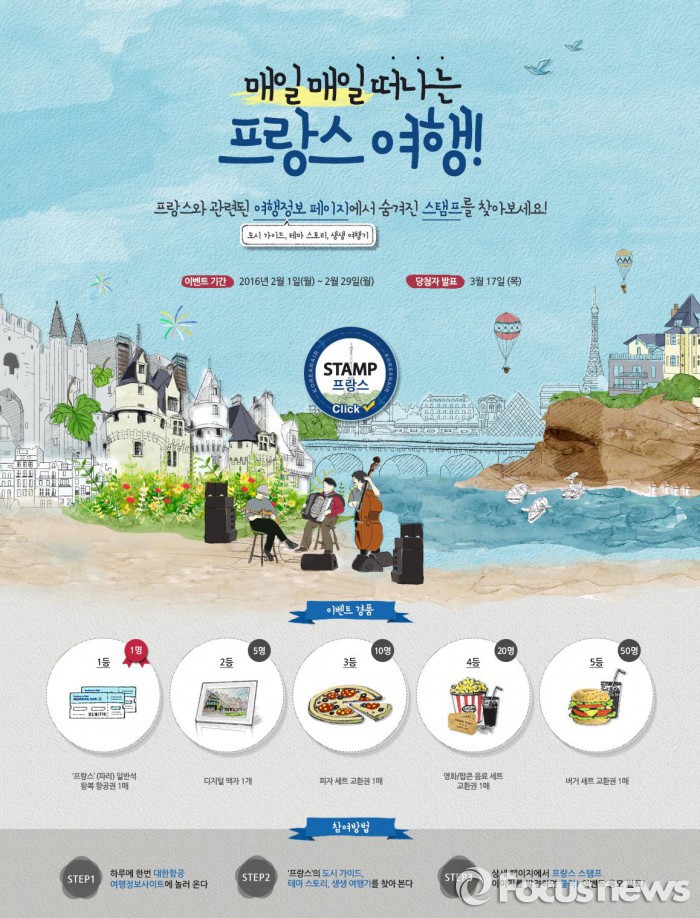 먼저 '매일매일 떠나는 프랑스 여행' 이벤트를 통해 1등 당첨자에게 파리 일반석 왕복 항공권을 증정한다. 여행정보사이트에서 프랑스의 도시 가이드, 테마 스토리, 생생 여행기 등의 메뉴에 숨겨진 스탬프를 발견하면 응모할 수 있다.