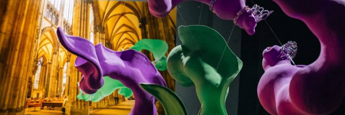 전시장 벽면은 마치 거대한 성전처럼 느끼게 하는 거대한 사진들이 설치되어 있다. 송광찬 사진작가가 촬영한 퀠른 성당 내부 사진이다. 거대한 성당 내부에는 괴상한 오브제들이 출현한다.