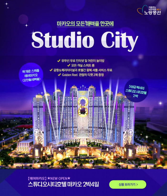 지난해 새로 문을 연 스튜디오 시티호텔 숙박이 준비돼 많은 고객들의 관심을 끌고 있다. 스튜디오 시티호텔은 마카오 코타이 지역 중심지에 위치한 복합카지노 리조트다. 모든 객실이 스위트룸으로 구성돼 있다. 건물 내에는 8자형 골든릴 관람차를 비롯해 배트맨 다크 플라이트 4D 체험관, 하우스 오브 매직쇼 등 총 7가지 다양한 엔터테인먼트 시설과 쇼핑공간이 갖춰져 있다.