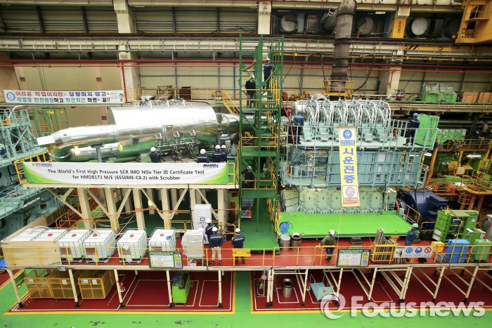 (서울=포커스뉴스) 현대중공업이 세계 최초로 고압의 엔진 배기가스를 정화할 수 있는 친환경 장치를 제작하는데 성공했다.