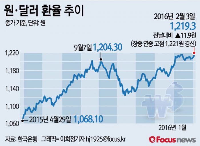 이날 달러 환율은 장중 고가인 1221.0원까지 오르면서 연중 최고치를 경신했다. 전달 18일 연중 고점이었던 1216.8원을 넘어섰고, 2010년 7월 7일 종가 기준 1223원까지 치솟은 지 5년 7개월 만에 1220원선을 돌파했다.