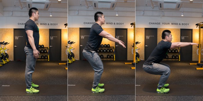 3 허벅지와 무릎이 수평이 될 때까지 내려갔다가 올라온다. 각자 체력에 맞게 반복 실시한다.