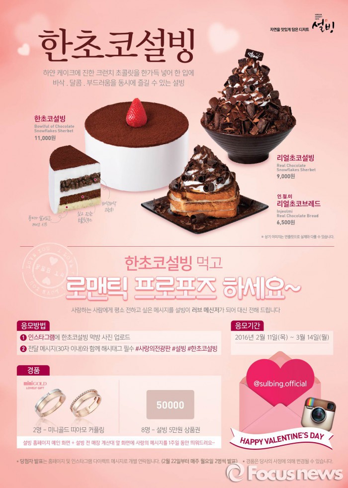 설빙은 밸런타인 데이를 기념해 3종 신메뉴를 선보인 바 있다. △케이크와 빙수에 초코크런치가 들어간 ‘한초코설빙’ △진한 초콜릿 컬을 올린 ‘리얼초코설빙’ △인절미에 초콜릿을 곁들인 ‘인절미 리얼초코브레드’ 등이다.사랑의 전광판 이벤트 포스터. <사진제공=설빙>
