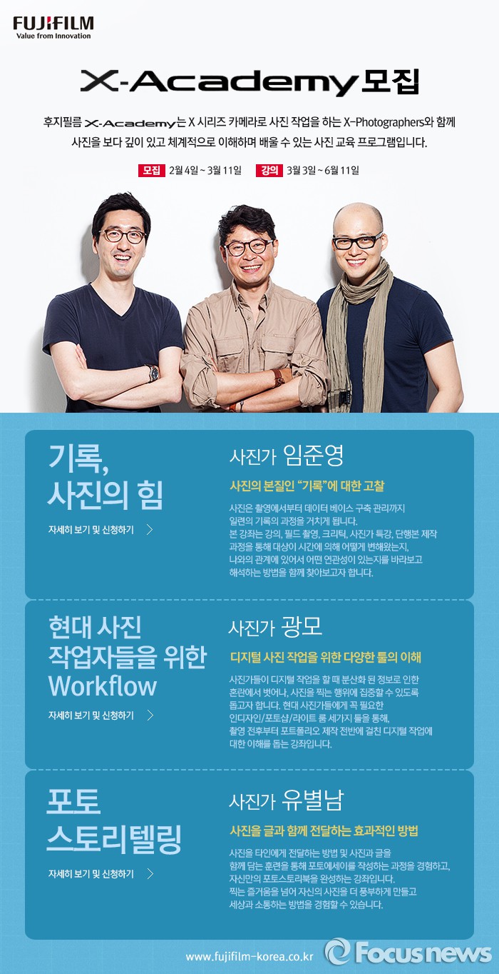 오는 3월부터 임준영, 광모, 유별남 사진가가 각각 '기록, 사진의 힘', '현대 사진가를 위한 작업 도구의 이해','포토 스토리텔링'을 주제로 강의한다. 수강료는 40만~50만원대이다. 후지필름 일렉트로닉 이미징 코리아 홈페이지에서 수강 신청할 수 있다.