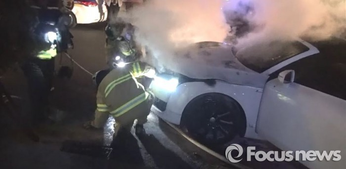 (서울=포커스뉴스) 7일 오전 5시 59분쯤 서울 강남구 대치동 한 도로에서 아우디 차량에 화재가 발생해 8분만에 완전히 꺼졌다.