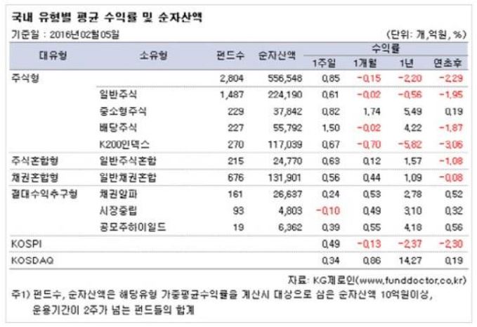 10일 펀드평가사 KG제로인에 따르면 설 연휴 전인 지난 5일 공시된 가격을 기준으로 펀드 수익률을 조사한 결과, 전체 국내 주식형펀드는 한주간 0.85% 올랐다.