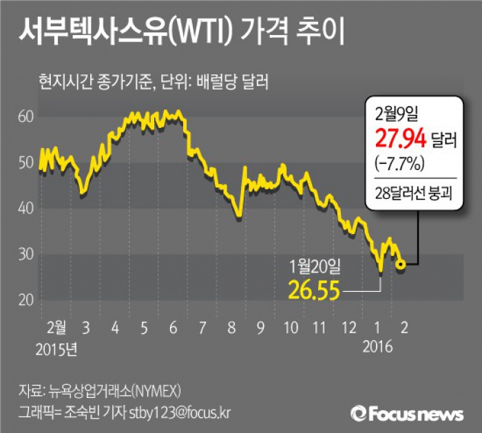 9일(현지시간) 뉴욕상업거래소(NYMEX)에서 미국 텍사스산 원유(WTI) 3월 인도분은 전일 대비 1.75달러(5.9%) 떨어진 배럴당 27.94달러로 거래를 마쳤다. 이는 1월 20일 이후 가장 낮은 수치다.