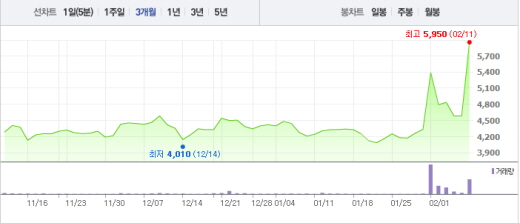 11일 오전 10시28분 현재 오공은 전일 대비 1370원(29.91%) 오른 5650원에 거래되고 있다.
