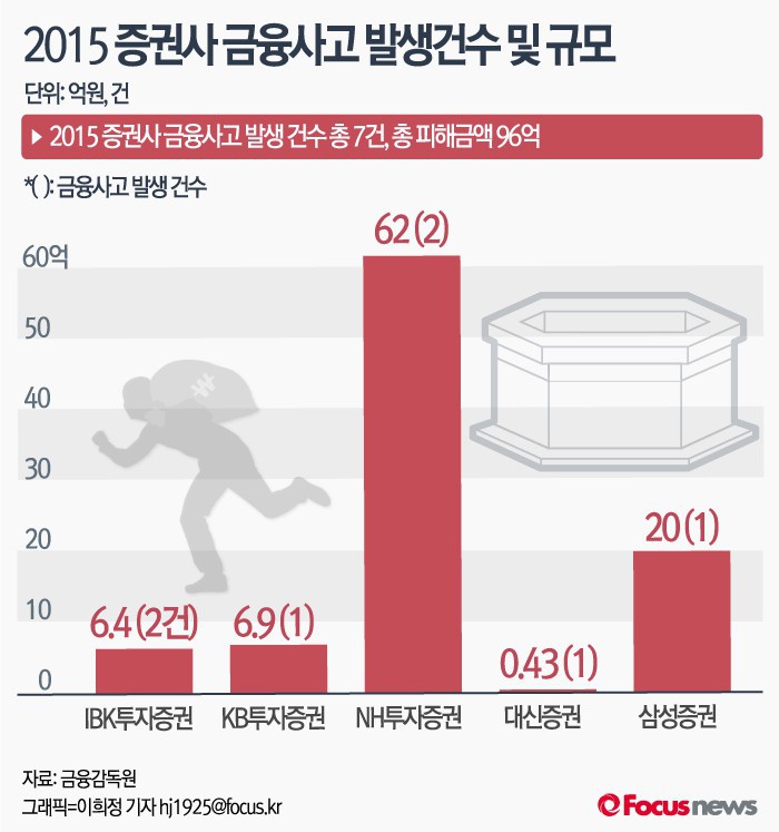 11일 금융감독원에 따르면 2015년 증권사들의 금융사고는 7건으로 전년(2014년) 대비 12건 줄어 들었다. 금융사고 규모도 2014년 170억원과 비교했을 때 약 44% 감소했다.